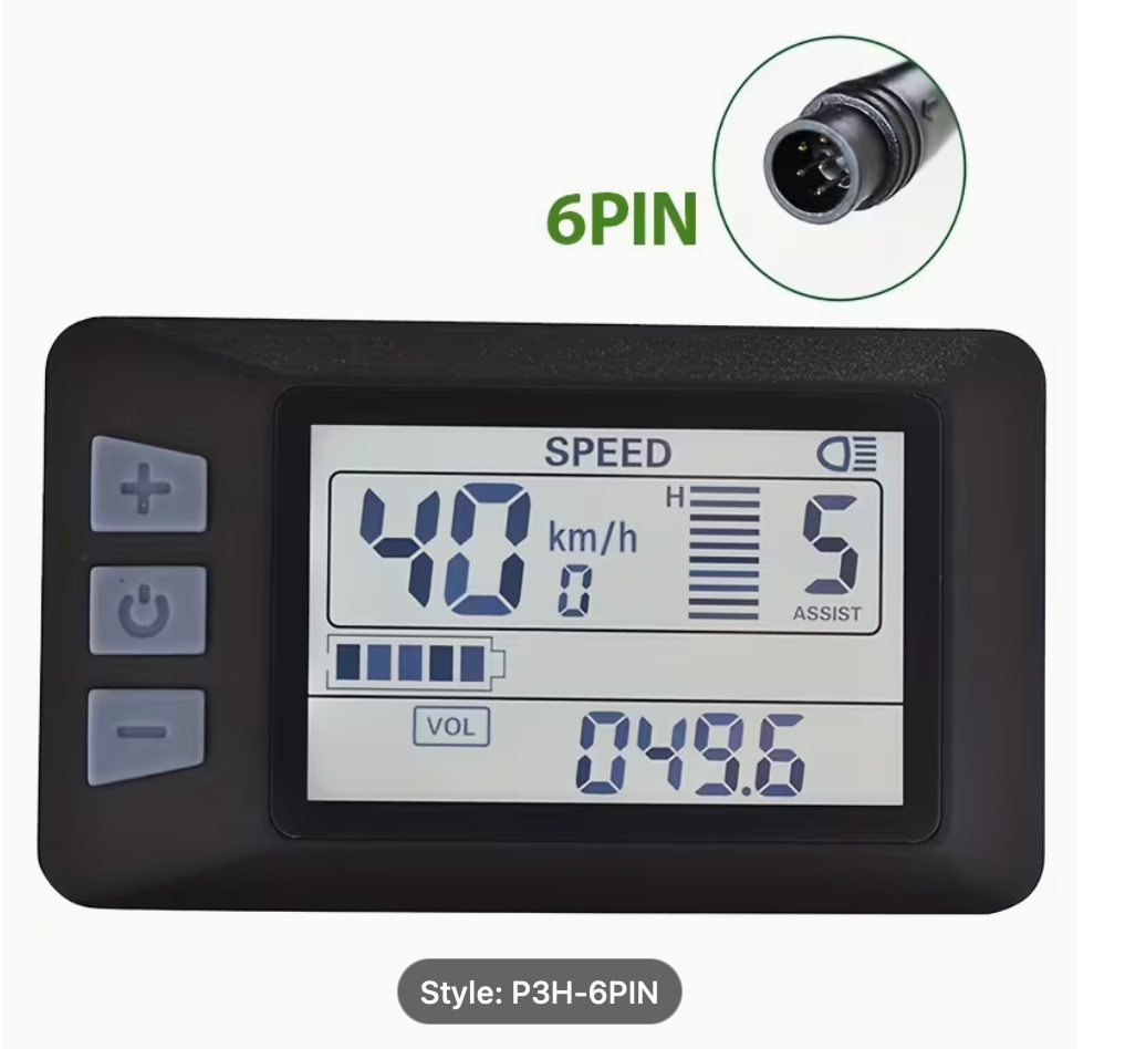 he P3H UART2 is a compact LCD display used on electric bicycles to show basic ride and system information such as speed and mileage. It mounts directly to the handlebars and connects to compatible e-bike controllers using a UART communication protocol.